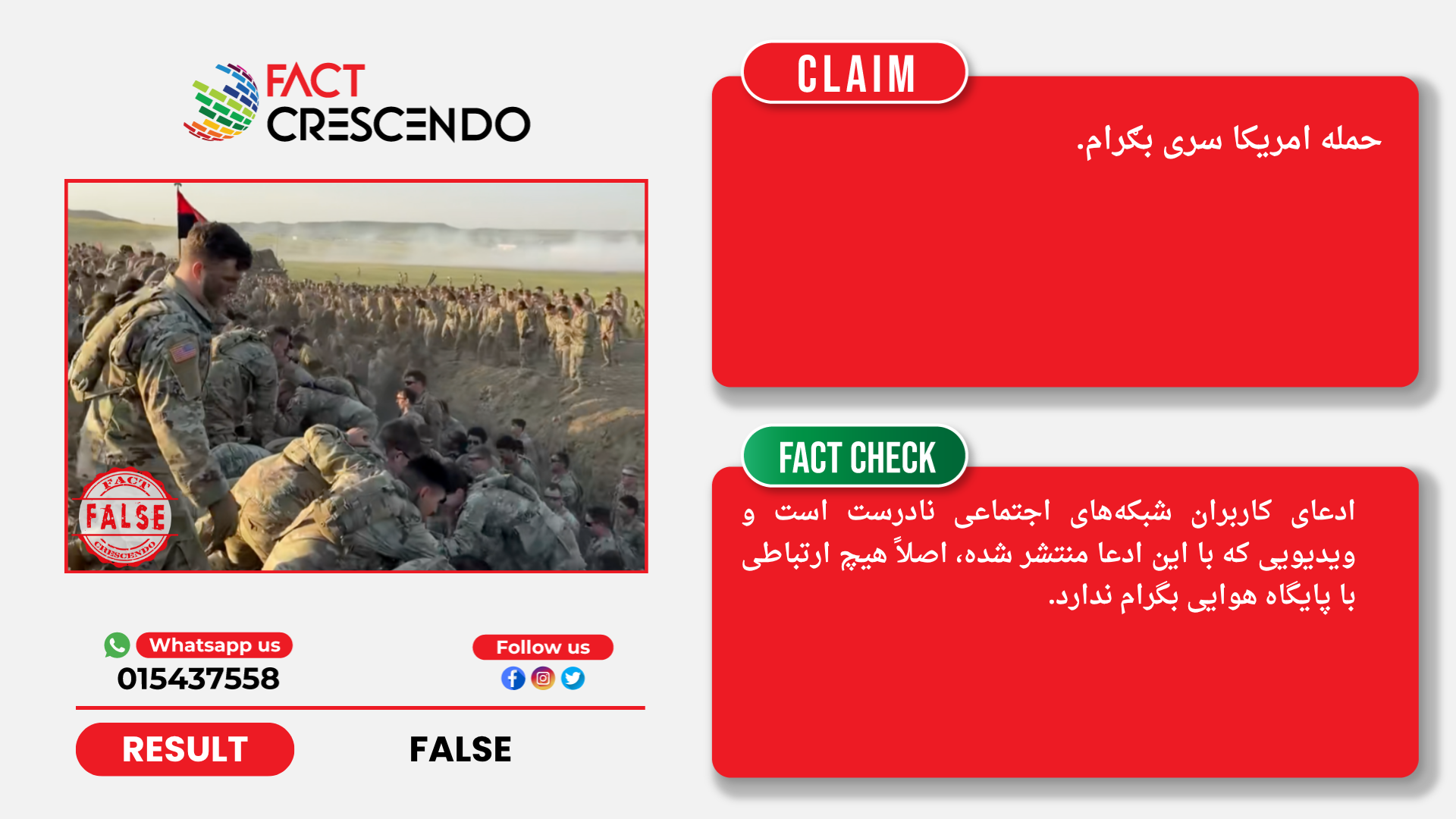 نتیجه ګیری: تحقیقات فکت کریسندو نشان داد که ادعای کاربران شبکههای اجتماعی نادرست است و ویدیویی که همراه با این ادعا منتشر شده، اصلاً هیچ ارتباطی با پایگاه هوایی بگرام ندارد.