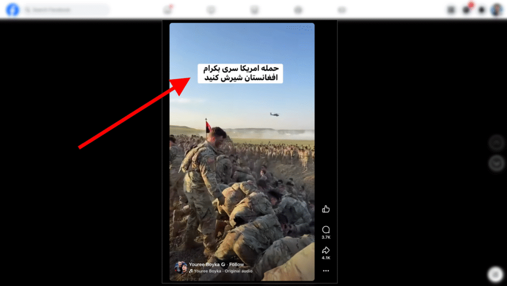 نخست، شما میتوانید چند پُست از کاربران فیسبوک و اینستاگرام را بهعنوان نمونه ببینید. این کاربران در کپشن ویدیو و نیز روی تصویر ویدیو چنین نوشتهاند: «حمله امریکا سری بګرام …».