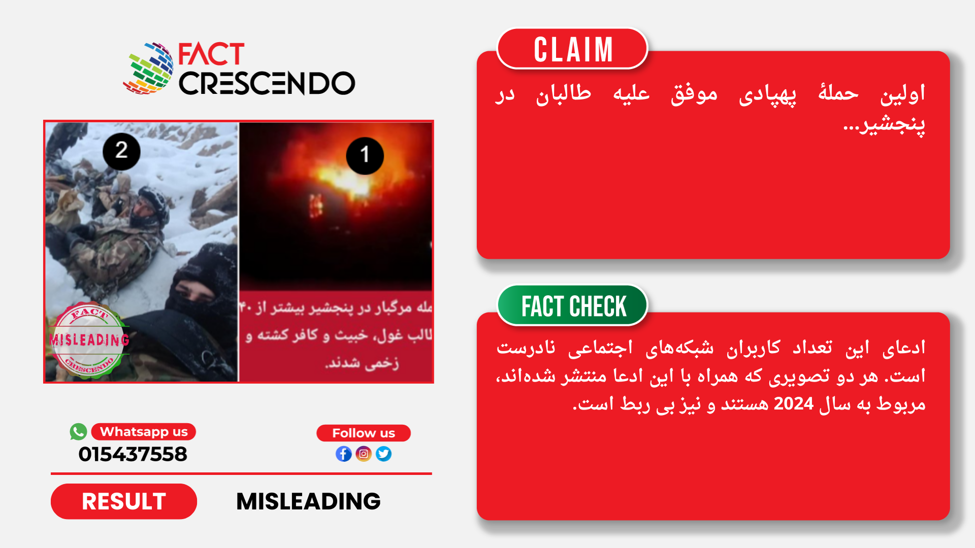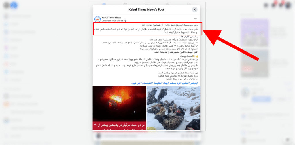 در تاریخ 9 و 10 دسمبر 2025، تعدادی از کاربران شبکههای اجتماعی فیسبوک و ایکس با نشر دو تصویر جداگانه ادعا کردند که گویا در پنجشیر بر طالبان حملات هوایی صورت گرفته و به آنها تلفات سنگینی وارد شده است. اما تحقیقات فکت کریسندو نشان میدهد که ادعای این کاربران حقیقت ندارد و تصاویر منتشر شده قبلی هستند.