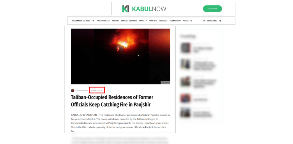 تصویر اول: این تصویر (۱) از ویبسایت Kabul Now در ماه مارس 2024 همراه با یک گزارش منتشر شده و نوشته است: خانههای مسکونی مقامات پیشین که اکنون در تصرف طالبان در ولایت پنجشیر قرار دارند، پیهم آتش میگیرند..