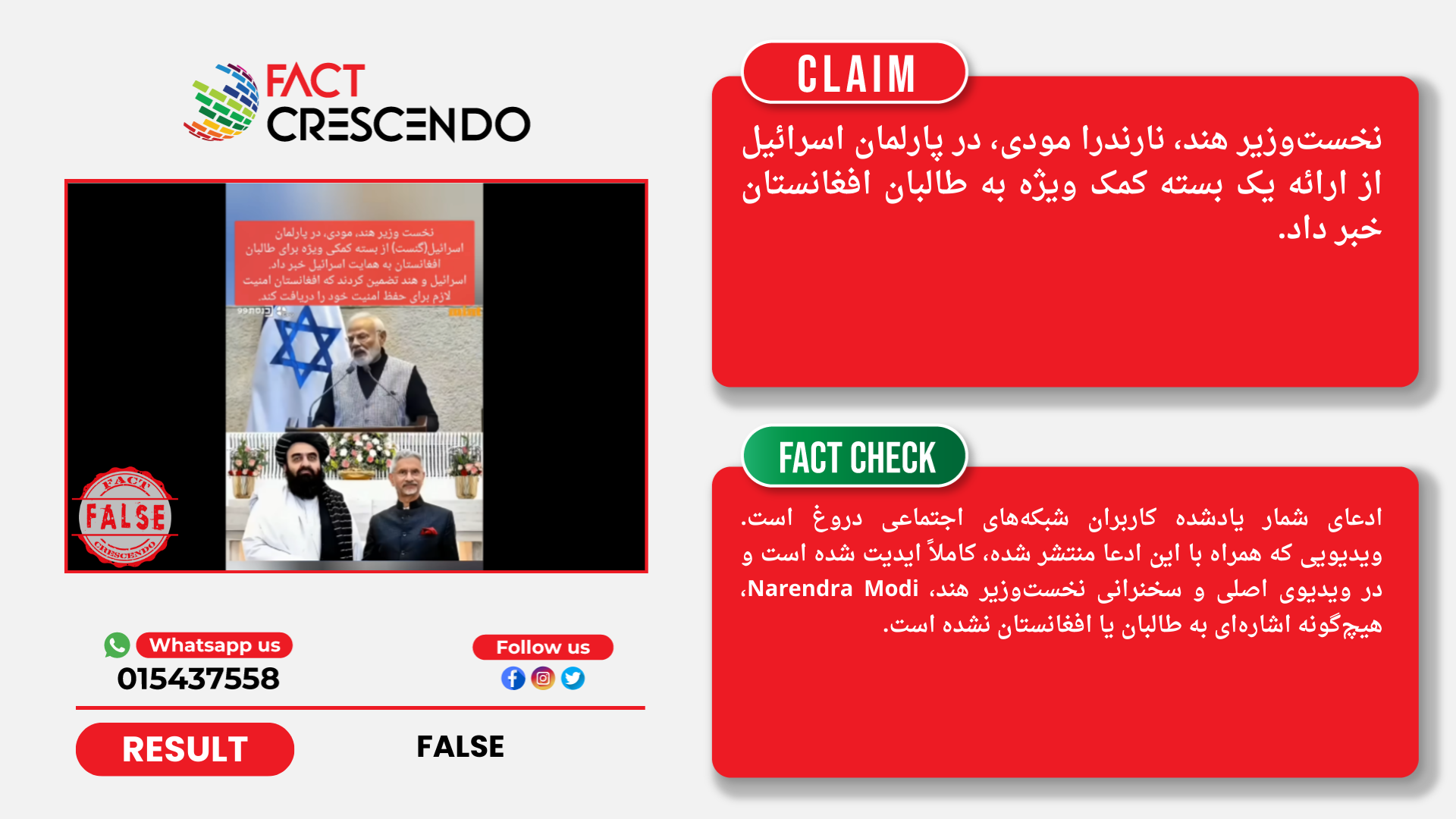 ادعای شمار یادشده کاربران شبکههای اجتماعی دروغ است. ویدیویی که همراه با این ادعا منتشر شده، کاملاً ایدیت شده است و در ویدیوی اصلی و سخنرانی نخستوزیر هند، Narendra Modi، هیچگونه اشارهای به طالبان یا افغانستان نشده است.