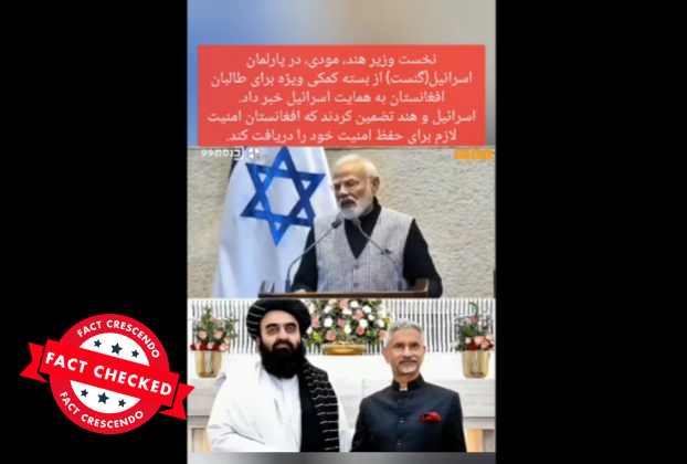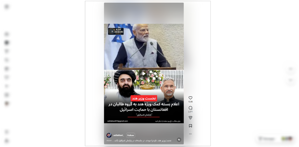 یک ویدیو که به سخنرانی مودی مطلوب شده است، توسط شماری از کاربران شبکههای اجتماعی در فیسبوک و انستاګرام با این ادعا منتشر شده است که گویا مودی در پارلمان اسرائیل از ارائه یک بسته کمک ویژه به طالبان افغانستان خبر داده است.