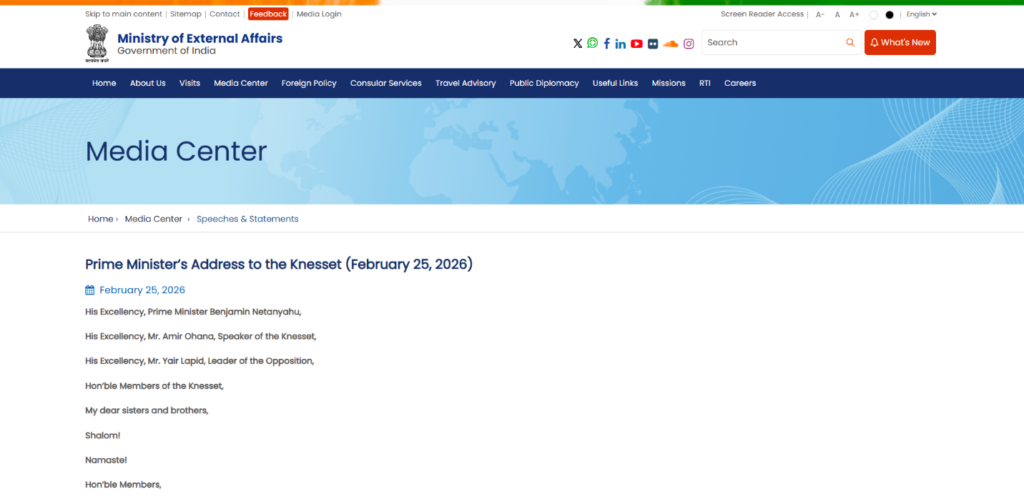 همچنان، برای دقت بیشتر، متن کامل این سخنرانی را در ویبسایت رسمی وزارت امور خارجه هند پیدا کردیم. این متن را نیز با دقت فراوان مطالعه کردیم، اما هیچ سخنی در آن یافت نشد که با ادعای مطرحشده مطابقت داشته باشد. شما میتوانید متن کامل سخنرانی نتانیاهو را در (اینجا) بخوانید.