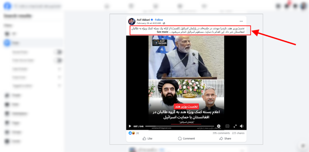 در ابتدا میتوانید چند پست زیر از کاربران فیسبوک و انستاګرام در شبکههای اجتماعی را بهعنوان نمونه مشاهده کنید. آنها همراه با این ویدیو چنین نوشتهاند: «نخستوزیر هند، نارندرا مودی، در پارلمان اسرائیل از ارائه یک بسته کمک ویژه به طالبان افغانستان خبر داد.».