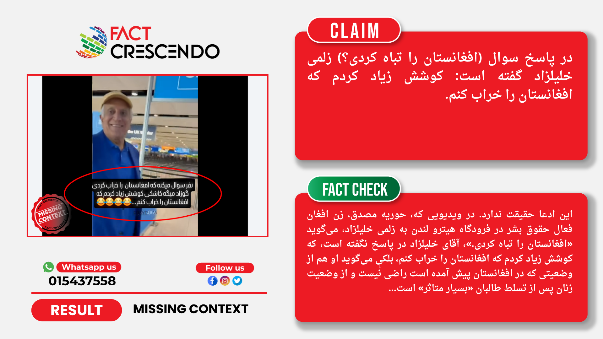 شماری از کاربران شبکههای اجتماعی ویدیویی از زلمی خلیلزاد، نماینده پیشین ویژه امریکا در امور صلح افغانستان، منتشر کرده و ادعا کردهاند که او در پاسخ به یک سوال «افغانستان را تباه کردی؟» گفته است: «کوشش زیاد کردم که افغانستان را خراب کنم». اما بررسی فکتکریسندو نشان میدهد که این ادعا نادرست است. در ویدیوی اصلی و کامل، زلمی خلیلزاد چنین سخنی نگفته است؛ بلکه گفته است که او نیز از وضعیت کنونی افغانستان راضی نیست و از شرایط زنان پس از تسلط طالبان «بسیار متأثر» است.