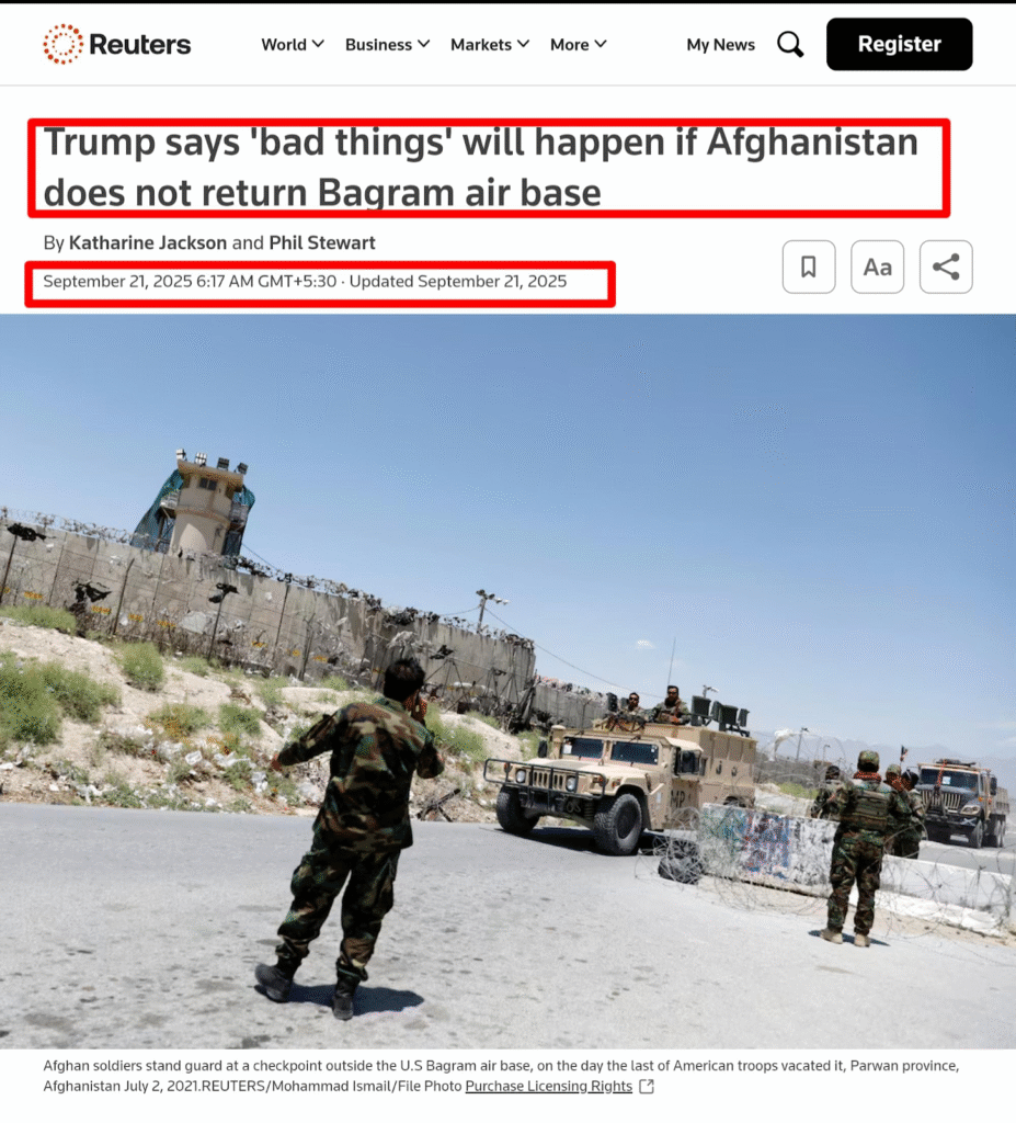 On September 21, Trump posted on his social media platform that “if Afghanistan did not return Bagram to those that built it, the United States of America, bad things are going to happen.” Speaking to reporters, he added that talks were ongoing and that he wanted the base handed back “immediately.” These remarks were sharper than his earlier references, where he had spoken of interest in the base without issuing direct warnings.