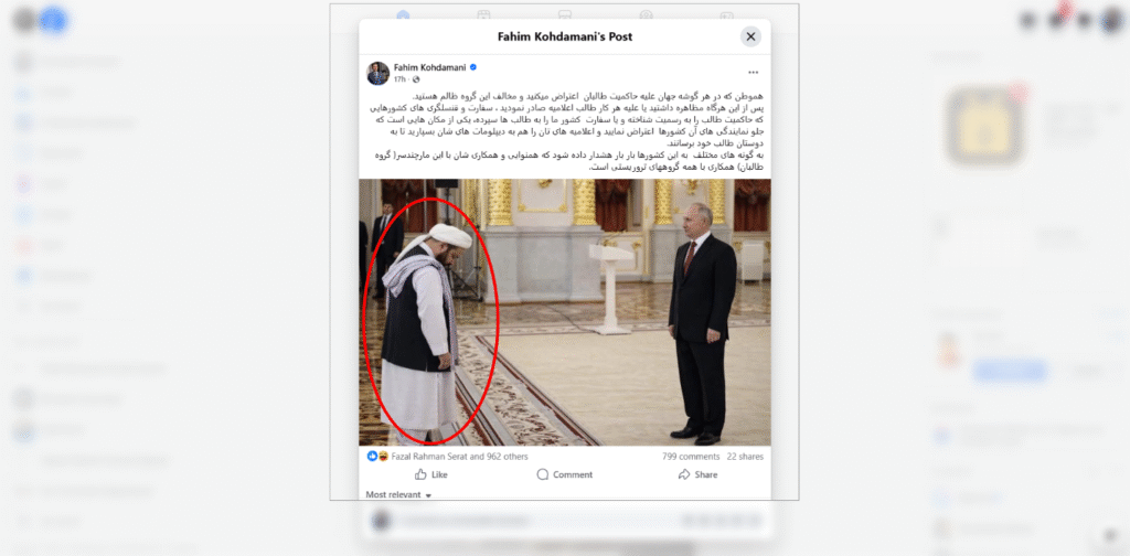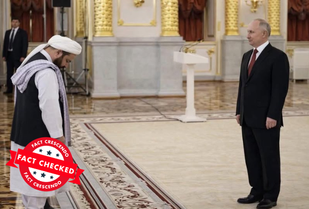 در روز پنجشنبه گذشته، مراسم پذیرش استوارنامههای سفیران ۳۴ کشور در کرملین برگزار شد که ولادیمیر پوتین، رئیسجمهور روسیه، نیز در آن حضور داشت. در جریان این مراسم، گلحسن حسن، سفیر حکومت طالبان، استوارنامه خود را به ولادیمیر پوتین تقدیم کرد. پس از آن، شماری از کاربران فیسبوک تصویری را منتشر کردند که در آن دیده میشود گلحسن حسن در برابر ولادیمیر پوتین ایستاده و سر خود را پایین آورده است. اما یافتههای فکتکریسندو نشان میدهد که این تصویر ایدیت شده است. در صحنه اصلی، این قسمی نیست که تصویر نشان میدهد. برای دانستن حقیقت کامل، این بررسی فکتکریسندو را بخوانید.