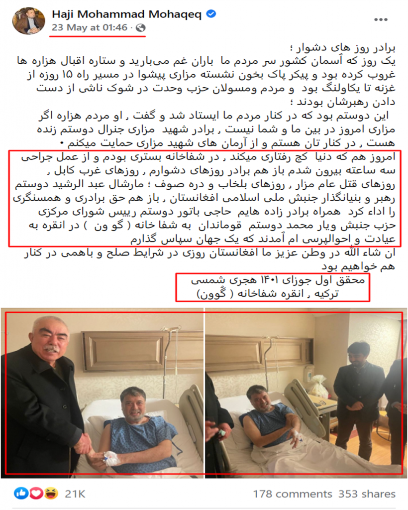 بر اساس یافتههای فاکتکریسیندو در حال حاضر عبدالرشید دوستم، معاون پیشین ریاست جمهوری و رهبر حزب جنبش ملی اسلامی افغانستان در کشور ترکیه است. حضور آقای دوستم در کشور ترکیه را محمد محقق، رهبر حزب وحدت اسلامی افغانستان تایید کرده است. محمد محقق در تازهترین یادداشت فیسبوکی خود که در ۲۳ می ۲۰۲۲ میلادی منتشر کرد، گفته است که عبدالرشید دوستم، باتور دوستم و یارمحمد دوستم در شفاخانه گوون در شهر انکارای ترکیه به عیادت او آمدهاند. دیدار این دو شخصیت سیاسی در حالی صورت گرفته که آقای محقق یک عمل جراحی را در آن شفاخانه سپری کرده است.