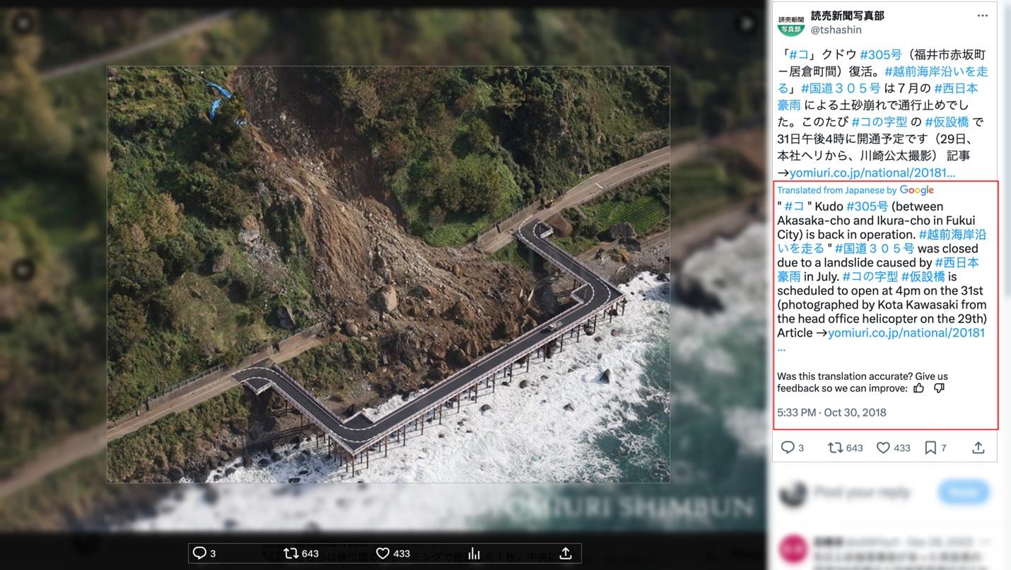 ما ابتدا در مورد این افت طبیعی که در آن زمان در جاپان، در منطقه Fukui رخ داده بود، کلمات کلیدی را جستجو کردیم تا گزارشهای رسانههای جاپانی، ارقام دقیق و اطلاعات را درباره این حادثه به دست آوریم. سپس، تصویر وایرال شدهای که در آن تصویری از یک پل به شکل (U) وجود دارد را در گوگل ایمیج جستجو کردیم و در نتیجه متوجه شدیم که به دلیل بارانهای شدید در شهر Fukui واقع در غرب جاپان، بر روی جاده ملی ۳۰۵ یک پل موقتی ساخته شده است، که دو ماه زمان برای ساخت پل و در مجموع حدود چهار ماه برای کل پروژه نیاز بوده است.