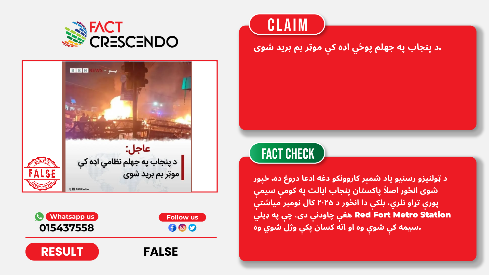 د ټولنیزو رسنیو یاد شمېر کاروونکو دغه ادعا دروغ ده. خپور شوی انځور اصلاً پاکستان پنجاب ایالت په کومې سیمې پورې تړاو نلري، بلکې دا انځور د ۲۰۲۵ کال نومبر میاشتې هغې چاودنې دی، چې په ډیلي Red Fort Metro Station سیمه کې شوې وه او اته کسان پکې وژل شوي وه.