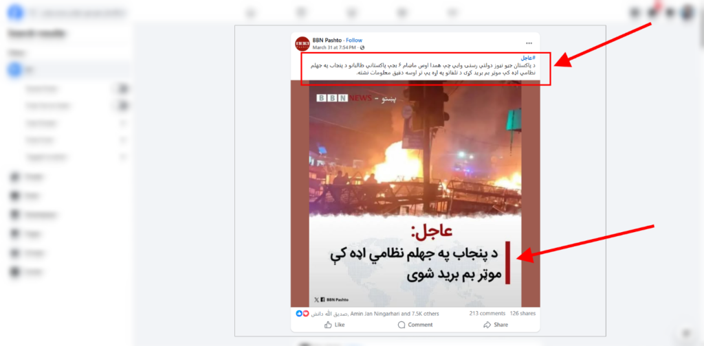 لومړی تاسې کولی شئ د ټولنیزو رسنیو فیسبوک کاروونکو لاندې څو پوسټونه د نمونې په توګه وګورئ. دوی په بېلا بېلو پوسټونو کې لیکلي دي: «د پنجاب په جهلم پوځي اډه کې موټر بم برید شوی.»