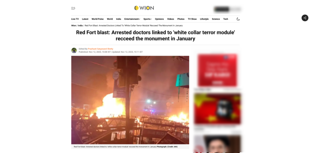 د 2025 نومبر میاشت کې د WION خبري چینل په خپل ویبسایټ کې همدا انځور له یو راپور سره خپور کړی دی او ورسره یې لیکلي دي: د سره کلا چاودنه: نیول شوي ډاکټران چې د “سپین کالر ترهګرې ډلې” سره تړاو لري، په جنوري کې یې د دې تاریخي ودانۍ څارنه کړې وه.