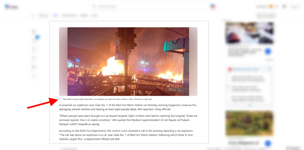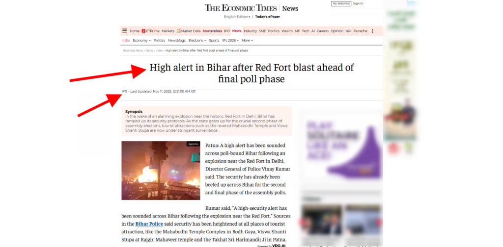 همدا راز په یو بل راپور کې هم دې انځور ته د عنوان په توګه لیکل شوي دي: د ډیلي چاودنه: لږ تر لږه اته کسان هغه مهال ووژل شول چې یو موټر د Red Fort Metro Station ته نږدې وچاودېد؛ Delhi او Mumbai په لوړ امنیتي خبرداري کې دي.
