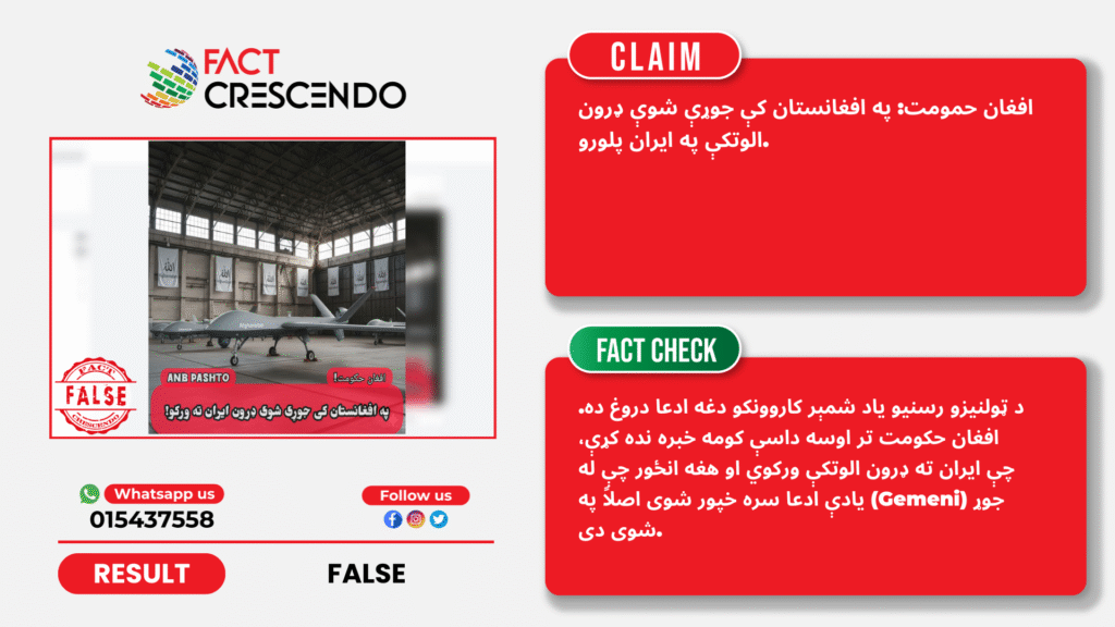 دا چې په دې وروستیو کې په ایران کې حالات ترینګلي دي، د ټولنیزو رسنیو فیسبوک یو شمېر کاروونکو د څو ډرون الوتکو یو انځور له دې ادعا سره خپور کړی، چې ګواکې افغان حکومت ویلي، چې په افغانستان کې جوړې شوې ډرون الوتکې په ایران پلوري. خو د فکټ کریسنډو موندنې ښیي، چې د یاد شمېر فیسبوک کاروونکو دغه ادعا دروغ ده او خپور شوی انځور د مصنوعي ځیرکتیا (Gemini) په وسیله جوړ شوی دی.