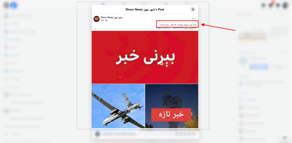 لومړی تاسې کولی شئ د ټولنیزو رسنیو فیسبوک کاروونکو لاندې څو پوسټونه د نمونې په توګه وګورئ. دوی له خپرو شویو انځورنو سره لیکلي دي: «تازه خبر؛ شيبه وړاندې کندهار مرکز باندې، نامعلوم ډرون.»