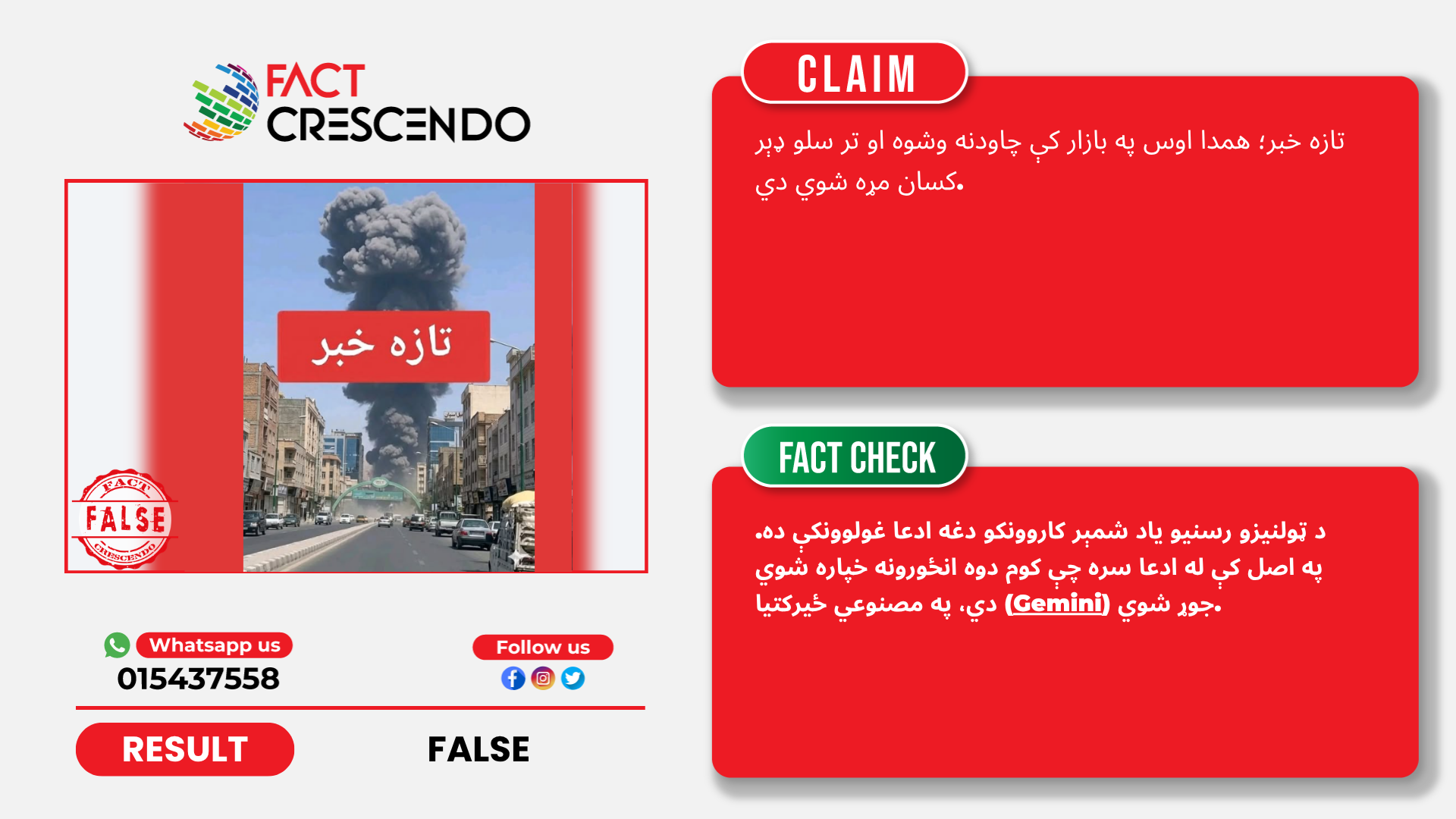 د ۲۰۲۶ کال اپرېل میاشت کې د ټولنیزو رسنیو فیسبوک یو شمېر کاروونکو په مصنوعي ځیرکتیا (Gemini) جوړ شوي انځورونه له دې ادعا سره خپاره کړي دي، چې ګواکې تازه په یو بازار کې درنه چاودنه شوې او سل کسان پکې وژل شوي دي. خو د فکټ کریسنډو موندنې ښیي، چې د یاد شمېر فیسبوک کاروونکو دغه ادعا غولوونکې ده او له ادعا سره خپاره شوي انځورونه په مصنوعي ځیرکتیا (Gemini) جوړ شوي دي.