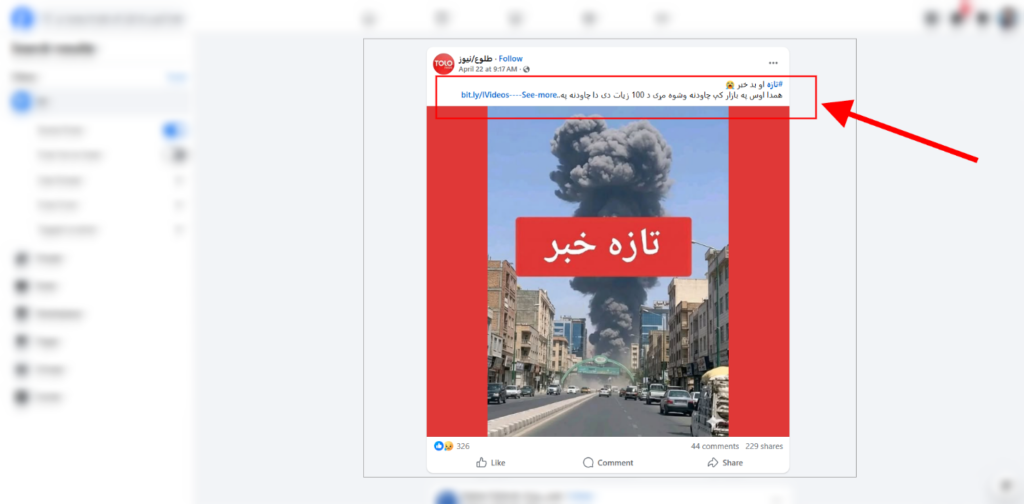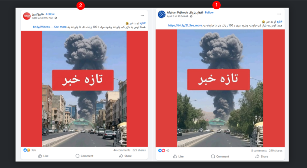 لومړی تاسې کولی شئ د ټولنیزو رسنیو فیسبوک کاروونکو لاندې څو پوسټونه د نمونې په توګه وګورئ. دوی له خپرو شویو انځورنو سره لیکلي دي: «تازه خبر؛ همدا اوس په بازار کې چاودنه وشوه او تر سلو ډېر کسان مړه شوي دي.»