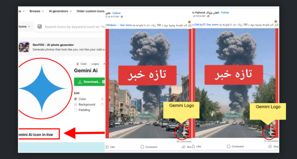موږ لومړی له ادعا سره خپاره شوي انځورونه په دقت سره وکتل او ومولېدل چې په انځورونو د جیمنای مصنوعي ځیرکتیا لوګو یا ایکن ښکاري، چې په لاندې توګه یې کتلی شئ. په انځور د مصنوعي ځیرکتیا (جیمینای) لوګو په دې مانا چې دغه انځور اصلاً په مصنوعي ځیرکتیا په ځانګړې توګه په جیمنای جوړ شوي دي.