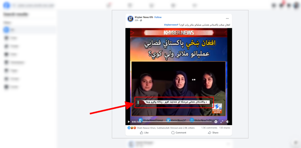 لومړی تاسې کولی شئ د ټولنیزو رسنیو فیسبوک کاروونکو لاندې پوسټ د نمونې په توګه وګورئ. دوی له خپرې شوې ویډیو سره غږیز تفصیل کې وایي: «افغان مېرمنو په افغانستان کې د پاکستان له لوري د ترهرګرو په نښه کولو ملاتړ کړی دی …».