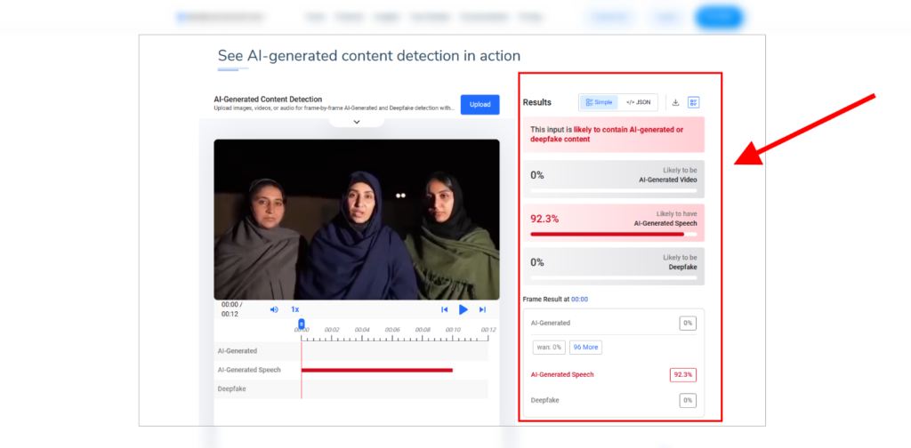 همدا راز موږ دغه ویډیو کلیپ په ځینو هغو ویبسایټونو کې هم ټیسټ کړ، چې تر یوې اندازې د مصنوعي ځیرکتیا جوړه شوې ویډیو ارزوي. هلته دغه ویبسایټ د دې ویډیو د غږ (خبرو) فیصدي 92.3 ښودله، چې ښکاروي دا خبرې په مصنوعي ځیرکتیا جنریټ شوې دي. تاسې یې هم په لاندې انځور کې کتلی شئ.