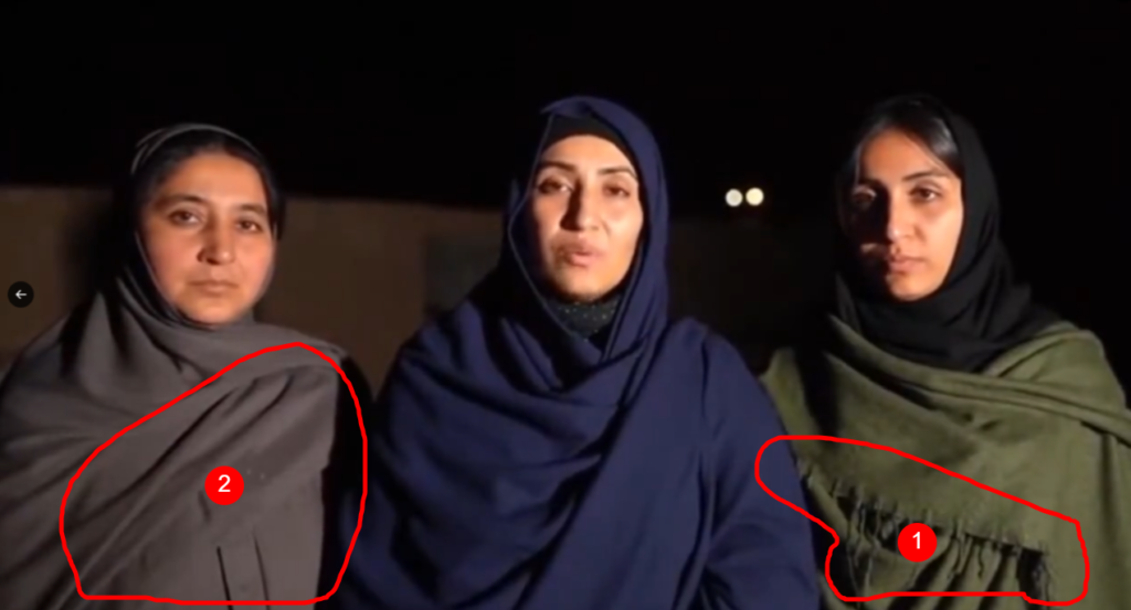 د لومړۍ شمېرې نقطه: ښي طرف چې کومې مېرمنې څادر اغوستی، د څادر د ځوڼدي او څنډه یې نورمال حالت کې ندي. ځونډي داسې ښکاري لکه غیر له کوم تړاو د څادر له څنډو سره نښتي وي، په داسې حال کې چې د څادر ځونډي عموماً د څادر له څنډې سره وتلي وي او پیرل شوي وي.