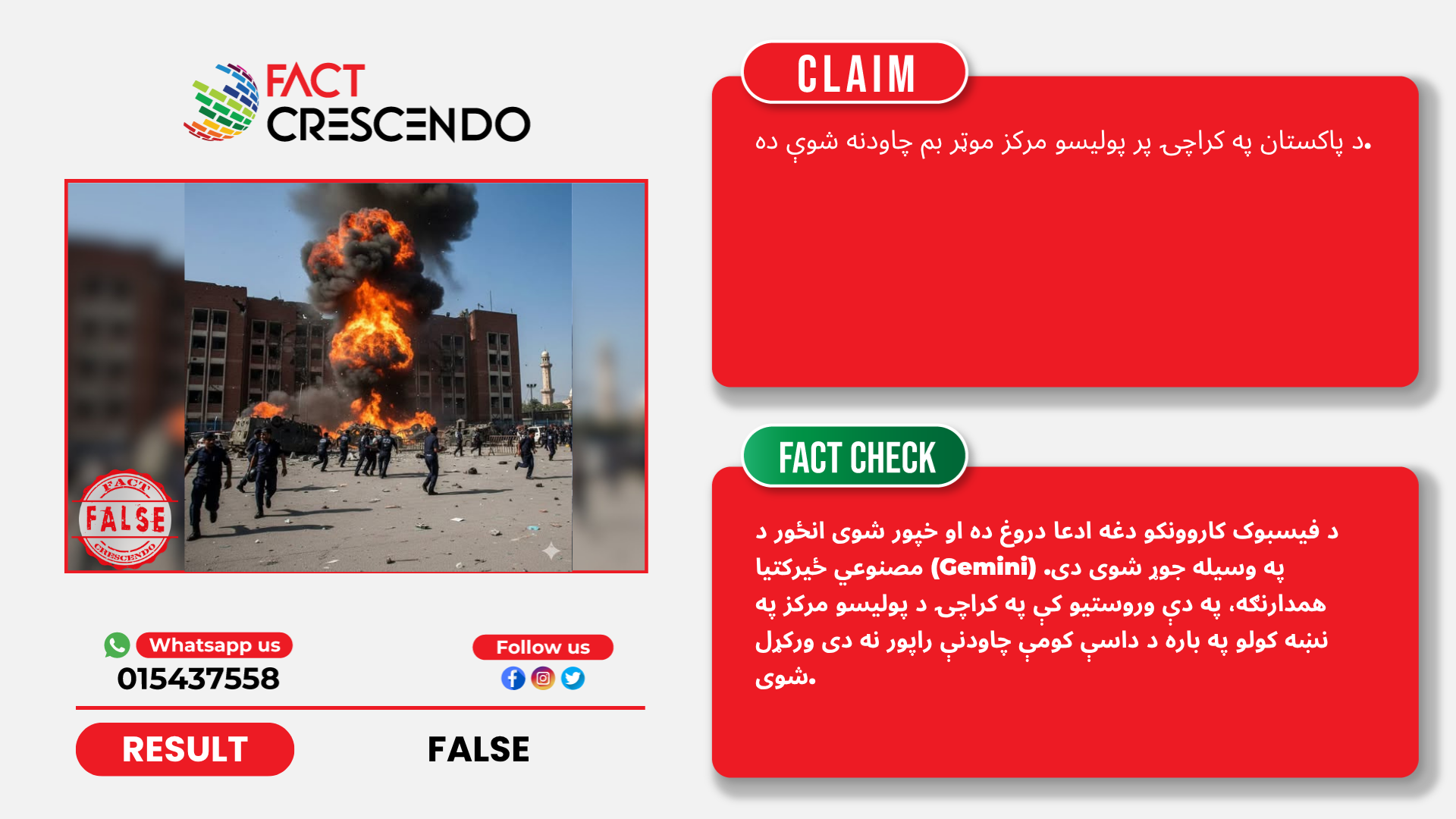 خو د فکټ کریسنډو موندنې ښیي چې د فیسبوک کاروونکو دغه ادعا دروغ ده او خپور شوی انځور د مصنوعي ځیرکتیا (Gemini) په وسیله جوړ شوی دی. همدارنګه، په دې وروستیو کې  په کراچۍ د پولیسو مرکزي دفتر په نښه کولو په باره د داسې کومې چاودنې راپور نه دی ورکړل شوی.