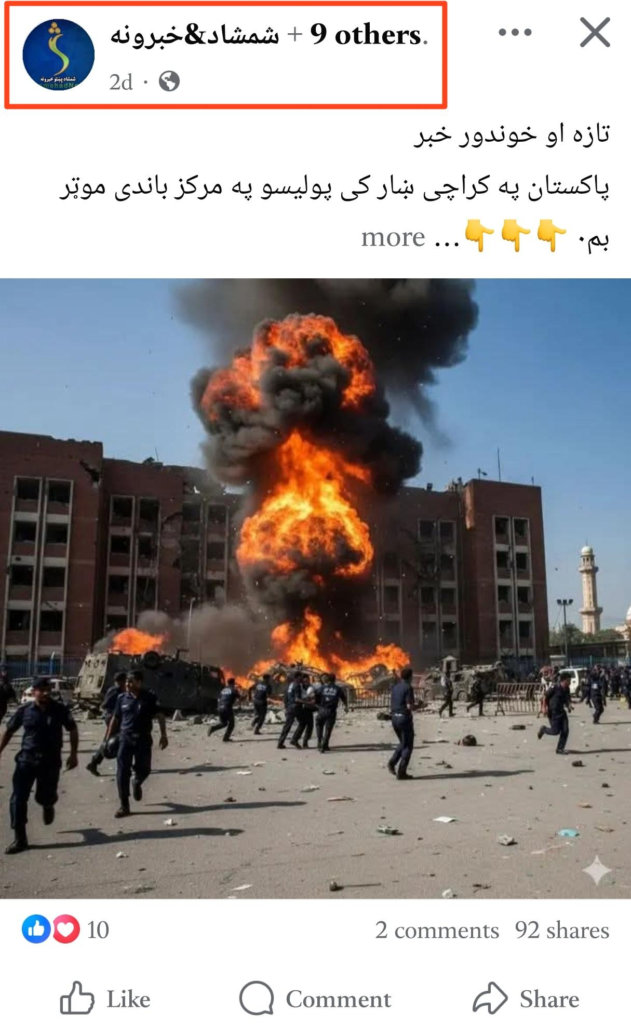 لومړی تاسې کولی شئ د ټولنیزو رسنیو فیسبوک کاروونکو لاندې څو پوسټونه د نمونې په توګه وګورئ. دوی له خپور شوي انځور سره خپلو پوسټونو کې لیکلي دي چې د پاکستان په کراچۍ کې پر پولیسو مرکز موټر بم چاودنه وشوه.