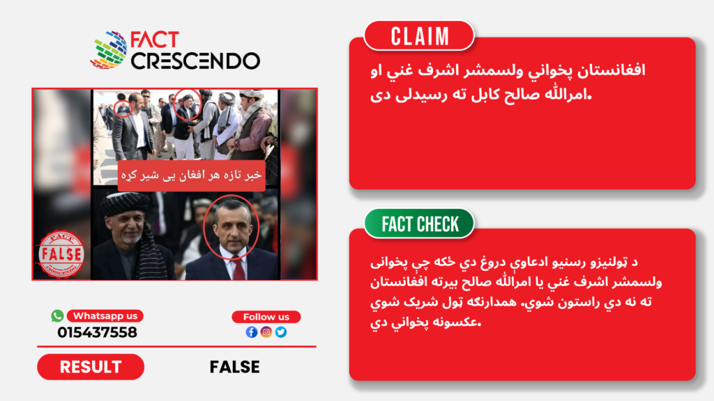 په هرصورت، د فیکټ کریسینډو موندنې ښیي چې د ټولنیزو رسنیو ادعاوې دروغ دي ځکه چې پخوانی ولسمشر اشرف غني يا امرالله صالح بیرته افغانستان ته نه دي راستون شوي. همدارنګه شریک شوي انځورونه پخواني دي.