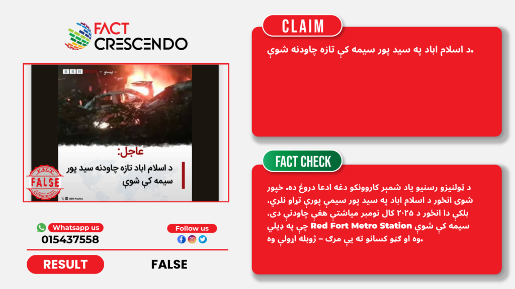 پایله: د فکټ کریسنډو څېړنو وښودله، چې خپور شوی انځور د اسلام اباد په سید پور سیمې پورې تړاو نلري، بلکې دا انځور د ۲۰۲۵ کال نومبر میاشتې هغې چاودنې دی، چې په ډیلي Red Fort Metro Station سیمه کې شوې وه او ګڼو کسانو ته یې مرګ – ژوبله اړولې وه.