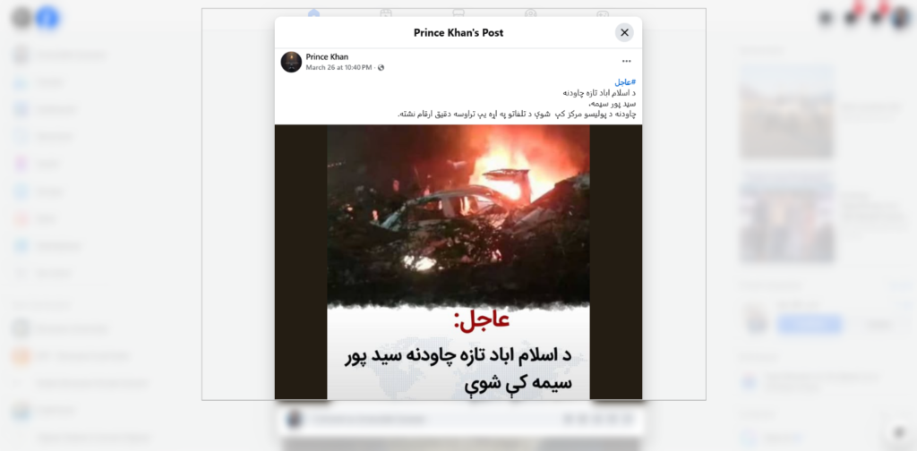 د روان ۲۰۲۶ کال مارچ میاشتې اخیر نېټو کې د ټولنیزو رسنیو ګڼ شمېر فیسبوک کاروونکو یو انځور له دې ادعا سره خپور کړی، چې ګواکې دا د اسلام اباد په سید پور سیمه کې د تازه چاودنې صحنه ده. خو د دغې ادعا په اړه د فکټ کریسنډو موندنې ښیي، چې د ټولنیزو رسنیو یاد شمېر کاروونکو دغه ادعا ناسمه ده او خپور شوی انځور اصلاً د ۲۰۲۵ کال نومبر میاشتې هغې چاودنې دی، چې په ډیلي Red Fort Metro Station سیمه کې شوې وه.