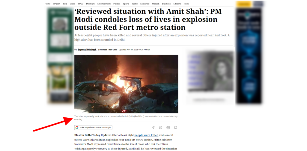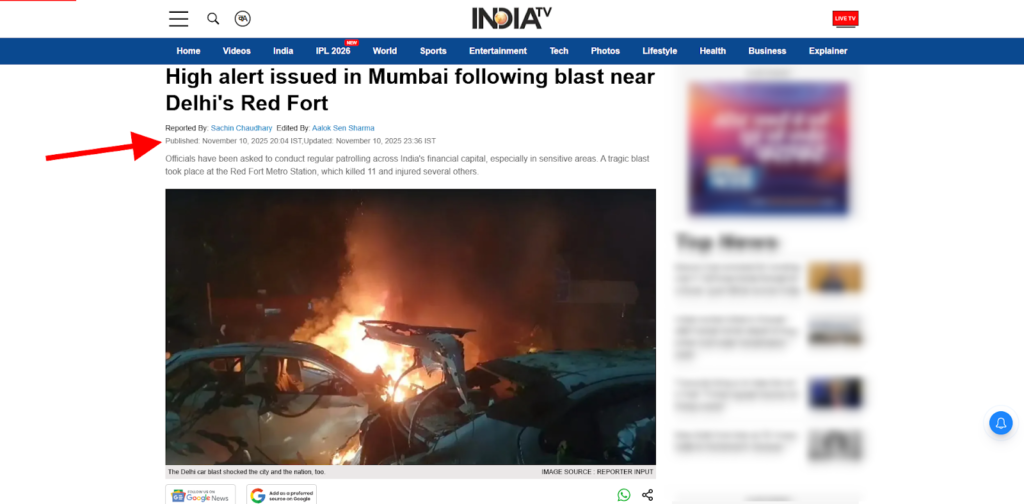 د 2025 نومبر میاشت کې INDIA TV په یو راپور کې همدا انځور خپور کړی او ورسره یې لیکلي: د ډیلي په Red Fort کې د چاودنې له امله لوړ امنیتي خبرداری.