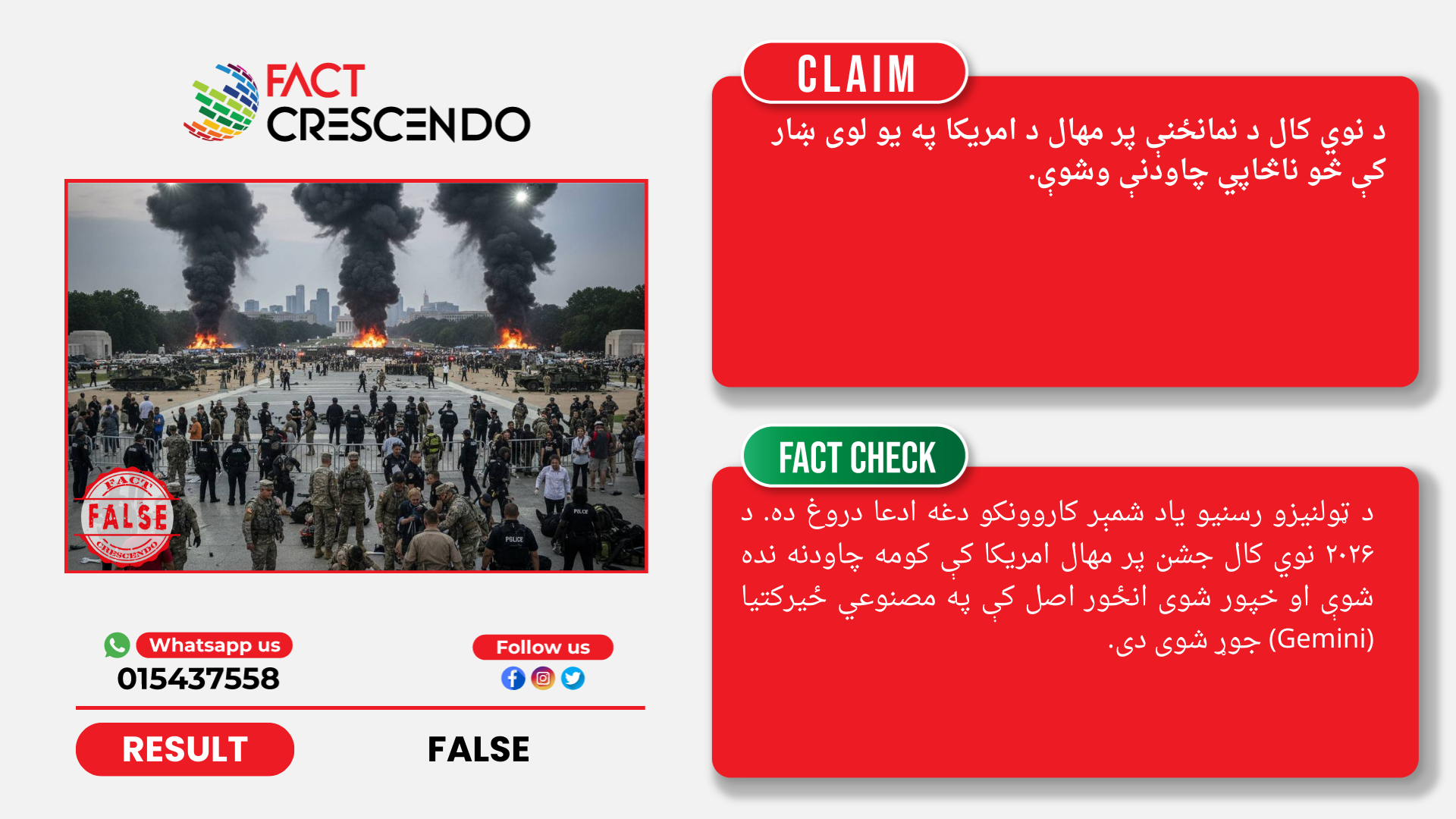 د ۲۰۲۶ کال پیل سره د ټولنیزو رسنیو فیسبوک یو شمېر کاروونکو د یو انځور په خپرولو سره ادعا وکړه، چې ګواکې د نوي کال (۲۰۲۶) جشن پر مهال د امریکا یو ښار کې چاودنه وشوه. خو د فکټ کریسنډو موندنې ښیي، چې د یاد شمېر فیسبوک کاروونکو دغه ادعا دروغ ده او خپور شوی انځور د مصنوعي ځیرکتیا (Gemini) په وسیله جوړ شوی دی.