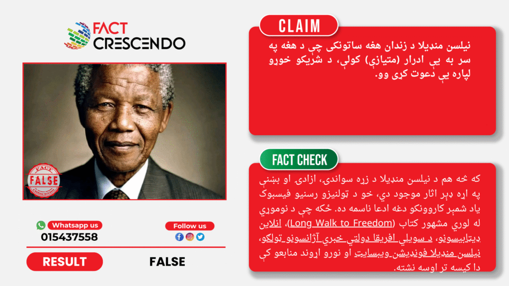پایله: د فکټ کریسنډو کتنې وښودله، چې که څه هم د نیلسن منډیلا د زړه سواندۍ، ازادۍ او بښنې په اړه ډېر اثار موجود دي، خو د ټولنیزو رسنیو فیسبوک یاد شمېر کاروونکو دغه ادعا ناسمه ده. ځکه چې د نوموړي له لوري مشهور کتاب (Long Walk to Freedom)، انلاین ډیټابیسونو، د سویلي افریقا دولتي خبري آژانسونو ټولګو، نیلسن منډیلا فونډیشن ویبسایټ او نورو اړوند منابعو کې دا کیسه تر اوسه نشته.