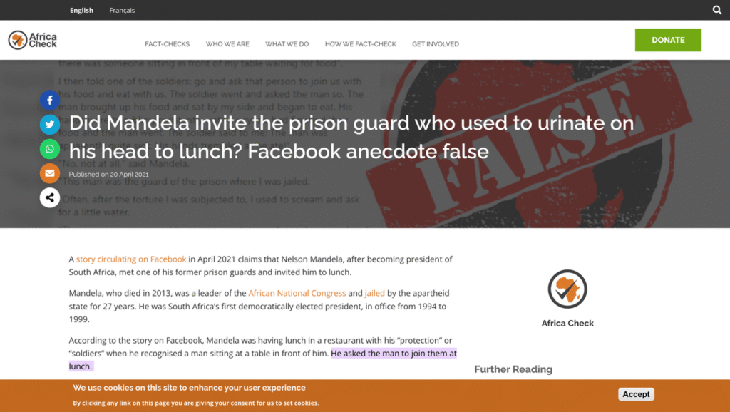 تاسې کولی شئ د Africa Check ویبسایټ کې هم په دې اړه انګلیسي ژبه کې بررسي او څېړنه وګورئ، چې هغوی هم په پایله کې لیکلي، چې د نیلسن منډیلا په اړه هغه کېسه چې ګواکې کله چې نیلسن منډیلا ولسمشر شو نو یوه ورځ یې د زندان هغه ساتونکی، چې د ده پر سر به ادرار کول، د غرمې ډوډۍ ته دعوت کړی وو، تر څو خلکو ته دا پیغام او درس ورکړي، چې غچ اخیستل ملتونه نه جوړوي او بښنه ملتونه جوړوي، غلته بللې ده.