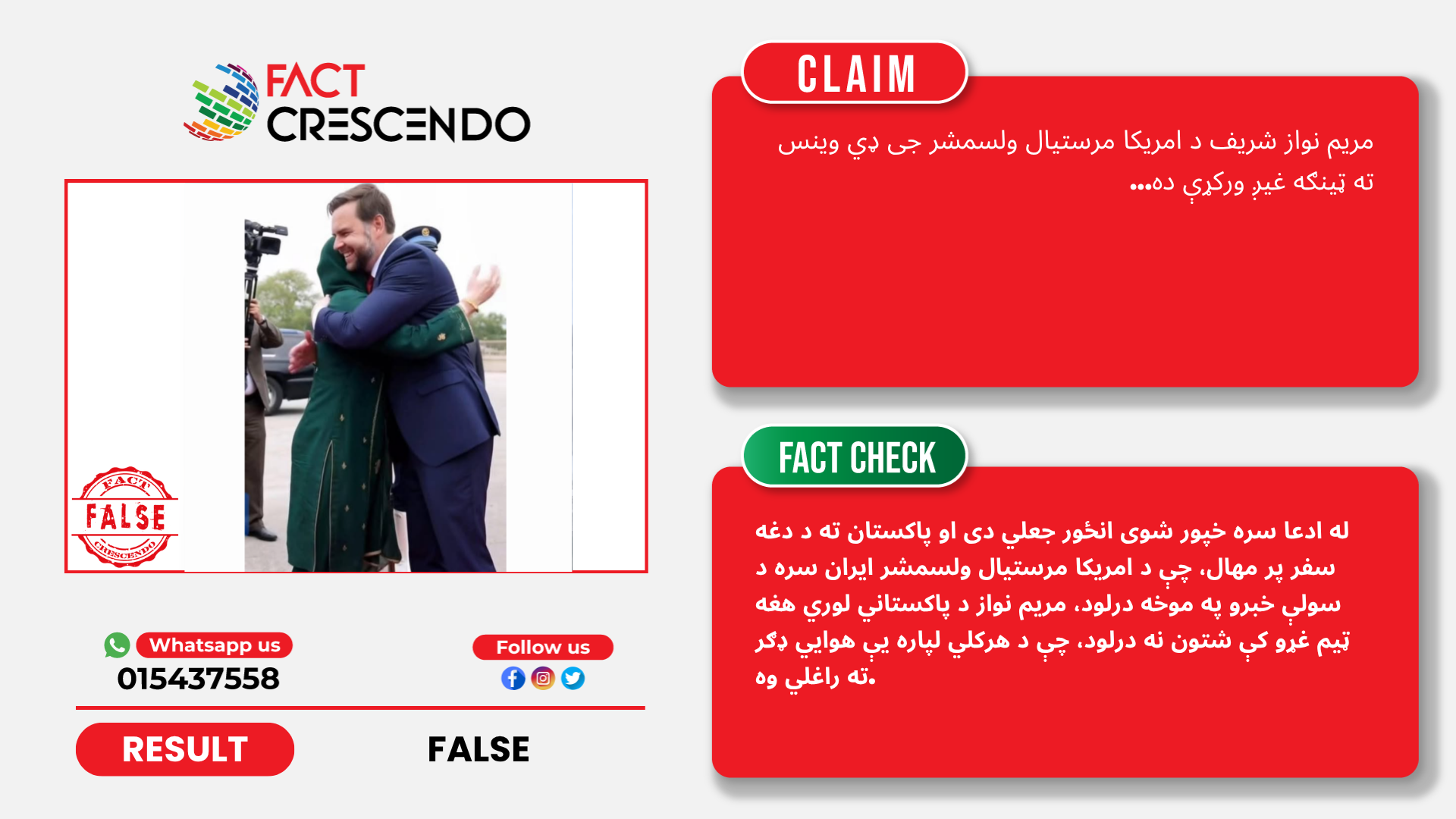 د امریکا-اسراییلو او ایران تر منځ د روانې جګړې په درشل کې د امریکا مرستیال ولسمشر جی ډي وینس څو ورځې وړاندې ایران سره د سولې خبرو لپاره پاکستان ته سفر درلود، چې له یوې ورځې خبرو وروسته بېرته د سولې له کوم تړون پرته امریکا ته ولاړ. د دې سفر په تړاو د ټولنیزو رسنیو ګڼ شمېر فیسبوک کاروونکو د پاکستان پنجاب ایالت اعلی وزېرې مریم نواز او د امریکا مرستیال ولسمشر جی ډي وینس ته منسوب یو انځور له دې ادعا سره خپور کړ، چې ګواکې مریم نواز، جی ډي ونس ته غېږ په غېږ هرکلی او رغبړ کړی دی. خو د دغې ادعا په اړه د فکټ کریسنډو موندنې ښیي، چې د ټولنیزو رسنیو یاد شمېر کاروونکو دغه ادعا حقیقت نلري او له یادې ادعا سره خپور شوی انځور جعلي دی.