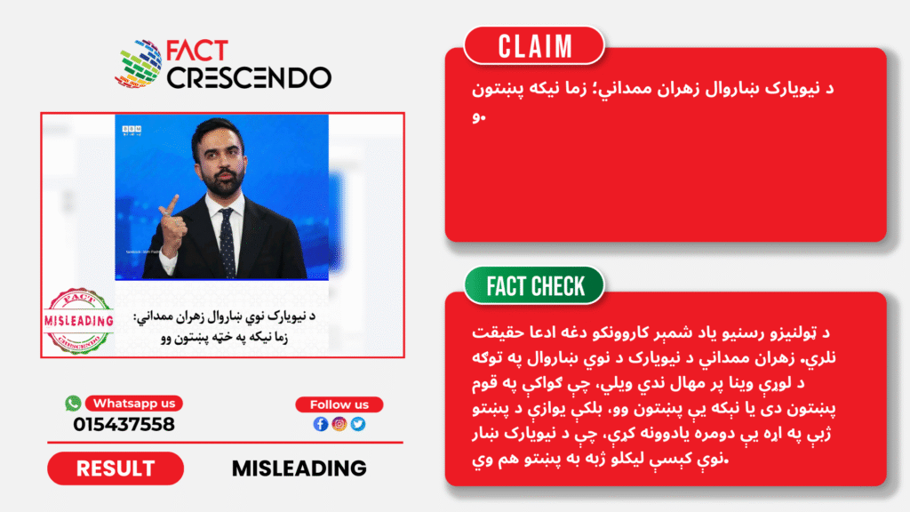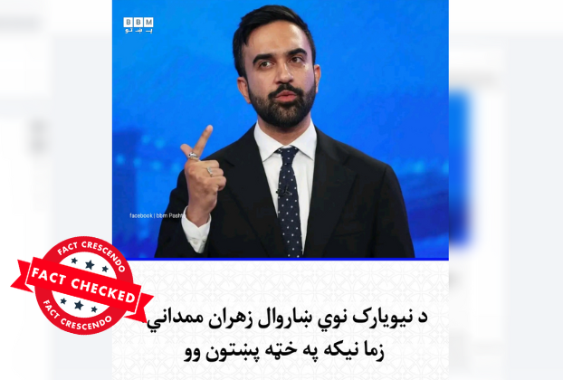 پایله: د فکټ کریسنډو څېړنو وښودله، چې د ټولنیزو رسنیو یاد شمېر کاروونکو دغه ادعا حقیقت نلري. زهران ممداني د نیویارک د نوي ښاروال په توګه د لوړې وینا پر مهال ندي ویلي، چې ګواکې په قوم پښتون دی یا نېکه یې پښتون وو، بلکې یوازې د پښتو ژبې په اړه یې دومره یادوونه کړې، چې د نیویارک ښار نوې کېسې لیکلو ژبه به پښتو هم وي.