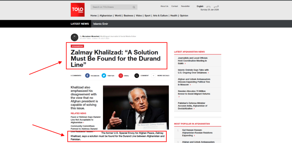 د 2026 کال جنوري په وروستیو نېټو کې د ټولنیزو رسینو فیسبوک ګڼ شمېر کاروونکو ادعا کړې، چې ګواکې د افغان سولې په چارو کې د امریکا ځانګړي پخواني استازي ښاغلي زلمي خلیلزاد ویلي، چې د افغانستان او پاکستان سرحدي سیمې، په ځانګړې توګه تورخم او بولدک تر اټکه، د افغانستان خاوره ګڼل کېږي او ټینګار یې کړی، چې پاکستان به خامخا یوه ورځ دغه سیمې افغانستان ته وسپاري. خو د فکټ کریسنډو څېړنه ښیي، چې د ټولنیزو رسنیو دغه ادعا دروغ درسته نده ده او زلمي خلیلزاد د ډیورڼد فرضي کرښې په اړه داسې الفاضو کومه خبره نده کړې، څه ډول یې چې د ټولنیزو رسنیو یاد شمېر کاروونکو ادعا کړې، بلکې د یوې پوښتنې په ځواب کې یې د ډیورنډ فرضي کرښې تاریخي شخړې په اړه ویلي، باید یو حل ولري…