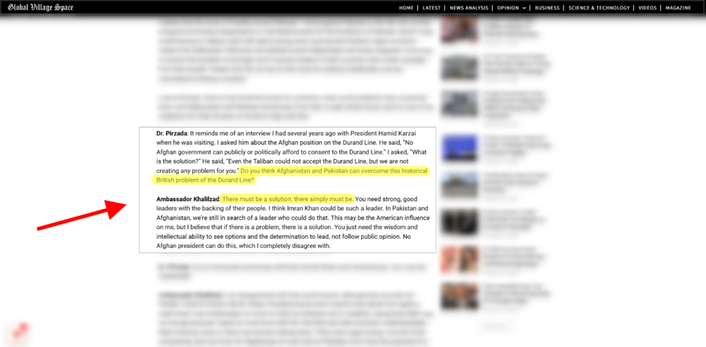 تر ټولو لومړی موږ هغه مرکه وموندله، چې یو پاکستاني خبریال (ډاکټر پیرزاده) له ښاغلي زلمي خلیلزاد سره د 2025 کال جولای میاشت کې کړې وه. موږ د دې مرکې ټول متن ولوست او هغه برخه مو وموندله، چې له خلیلزاد د ډیورنډ فرضي کرښې تاریخي شخړې په اړه ورځیني خبریال پوښتنه کړې ده. خبریال پوښتلې، چې … ایا تاسو فکر کوئ چې افغانستان او پاکستان کولی شي د ډیورنډ فرضي کرښې تاریخي ستونزې حل ته ورسیږي؟