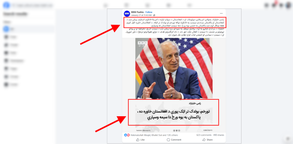 لومړی تاسې کولی شئ د ټولنیزو رسنیو فیسبوک کاروونکو لاندې څو پوسټونه د نمونې په توګه وګورئ. دوی په خپلو پوسټونو کې د زلمي خلیزاد له قوله لیکلي دي: «خلیلزاد: تورخم، بولدک او تر اټک پورې خاوره د افغانستان ده او پاکستان به خامخا یوه ورځ دا سیمې افغانستان ته سپاري.»