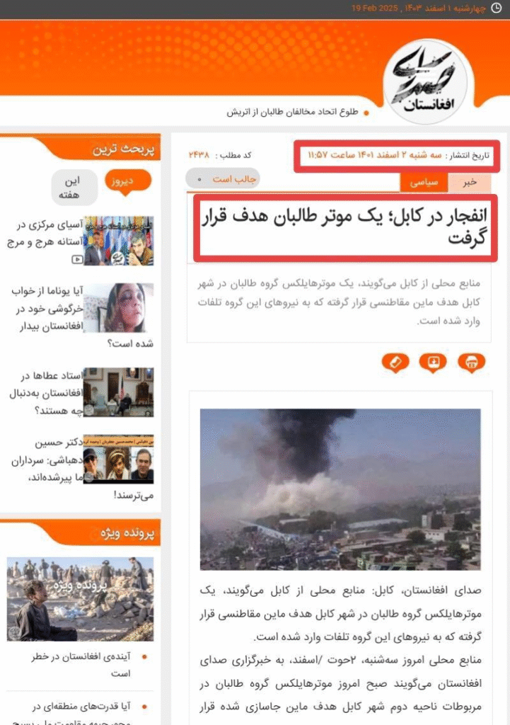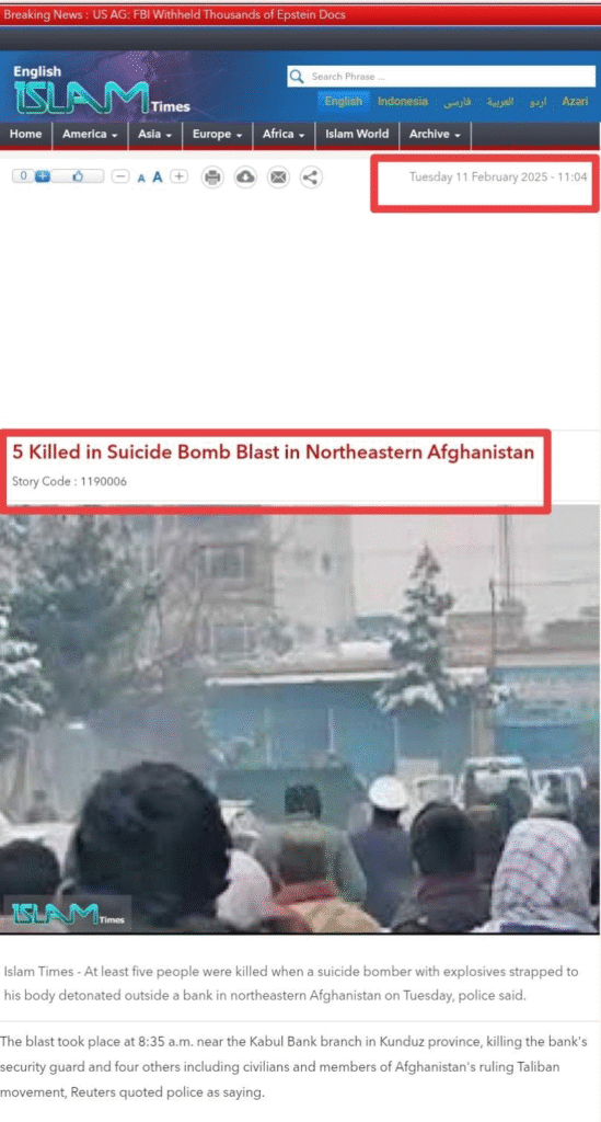 د ګوګل له لارې د دوهم انځور د لټون په کارولو سره، موږ وموندله چې دوهم انځور هم زوړ دی او د اسلام ټایمز په نوم د یوې خبري ویب پاڼې لخوا خپور شوی او د خپرې شوې مقالې له مخې، دا انځور د ۲۰۲۵ کال د فبروري په ۱۱مه د افغانستان په شمال ختیځ ولایت کندوز کې د بانک بهر د یوه ځانمرګي بریدګر د چاودیدونکو توکو سره د ځان په چاودنه کې لږ تر لږه پنځه کسان ووژل شول.