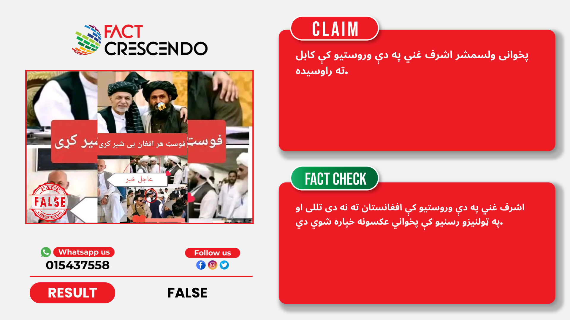 په هرصورت، د فیکټ کریسینډو موندنې ښیي چې د ټولنیزو رسنیو ادعاوې دروغ دي ځکه چې پخوانی ولسمشر اشرف غني بیرته افغانستان ته نه دی راستون شوی او نه یې د طالبانو له مشرانو سره لیدلي دي. همدارنګه ټول شریک شوي عکسونه زاړه دي.