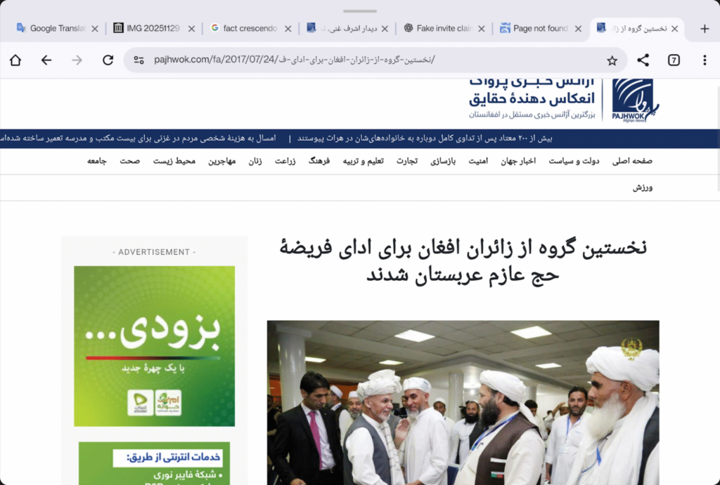 د ګوګل عکس د لټون په کارولو سره موږ وموندله چې دا عکس د پژوک نیوز لخوا د جولای په ۲۴مه، ۲۰۱۷ کال کې خپور شوی و. د خبر مقالې له مخې، دا عکس هغه وخت اخیستل شوی کله چې پخواني ولسمشر اشرف غني د حج له حاجیانو سره ولیدل.