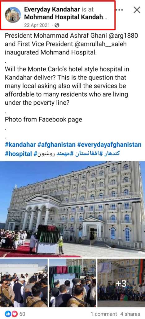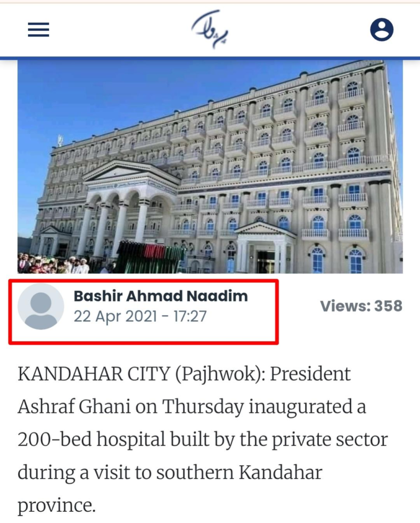 ورته انځور د ټولنیزو رسنیو کاروونکو ترمنځ د ۲۰۲۲ کال په اپریل کې شریک شو کله چې اشرف غني په کندهار پیونت کې د روغتون پرانیسته وکړه. تاسو کولی شئ د ټولنیزو رسنیو خبرونه او د دې په اړه مستند رسنۍ راپورونه لاندې وګورئ:
