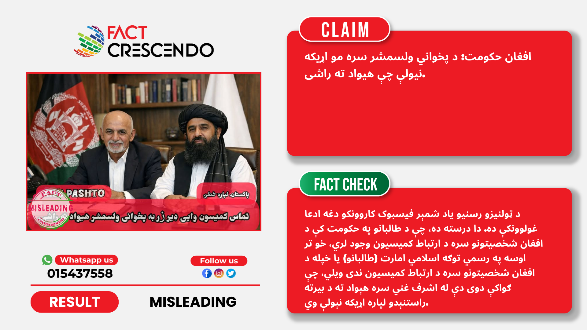 د 2026 کال جنوري په بېلا بېلو نېټو د ټولنیزو رسینو فیسبوک ګڼ شمېر کاروونکو ادعا کړې، چې ګواکې د افغانستان فعلي حکومت (طالبانو) تماس کمېسیون، د افغانستان له پخواني ولسمشر محمد اشرف غني سره اړیکه نېولې او ممکن ښاغلی پخوانی ولسمشر محمد اشرف بیرته هېواد ته راستون شي. خو د فکټ کریسنډو څېړنه ښیي، چې د ټولنیزو رسنیو دغه ادعا غولوونکې ده او تر اوسه په رسمي توګه اسلامي امارت (طالبانو) داسې کوم اعلان یا خبر ندی ورکړی، چې ګواکې له اشرف غني سره دې دوی مشخصاً اړیکه نېولې وي او هېواد ته یې د بیرته راستنېدو لپاره ترې غوښتنه کړې وي.