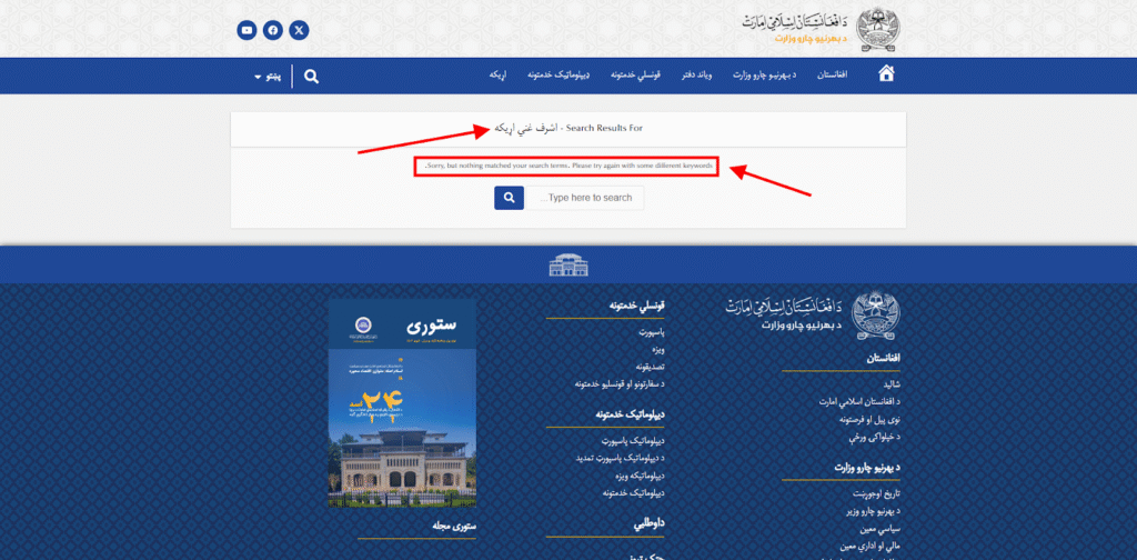 موږ وروسته له دې چې په ملي او نړیوالو معتبرو رسنیو کې مو هیڅ داسې خبر ونه موندلو، چې شوې ادعا support کړي، د بهرنیو چارو وزارت ویبپاڼه هم سکرول کړه او هم مو پکې د (اشرف غني اړیکه) کلیدي تورو ته ورته کلمات پکې وپلټل. خو هلته نتېجه دا شوه، چې داسې کوم خبر یا اعلان نه خپور شوی.
