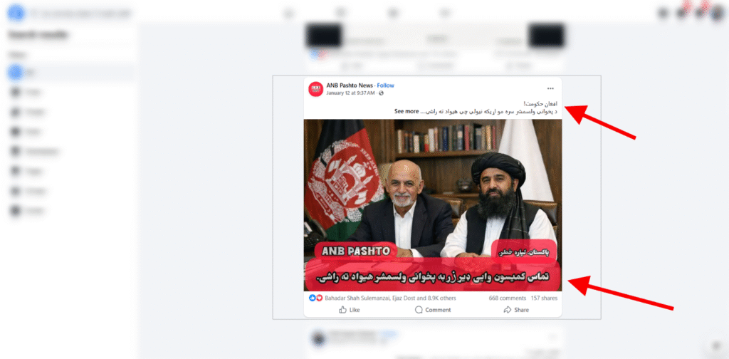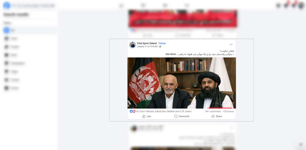 لومړی تاسې کولی شئ د ټولنیزو رسنیو فیسبوک کاروونکو لاندې څو پوسټونه د نمونې په توګه وګورئ. دوی په خپلو پوسټونو کې د افغانستان فعلي حکومت (طالبانو) له قوله لیکلي دي: «افغان حکومت: د پخواني ولسمشر سره مو اړيکه نيولې چې هيواد ته راشى.»