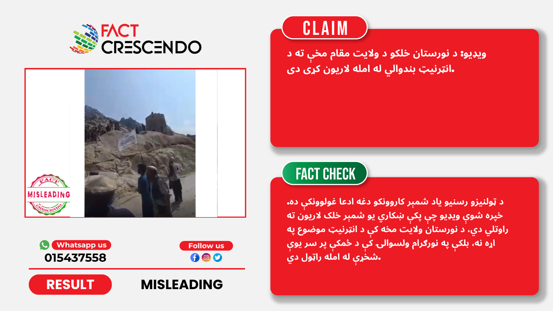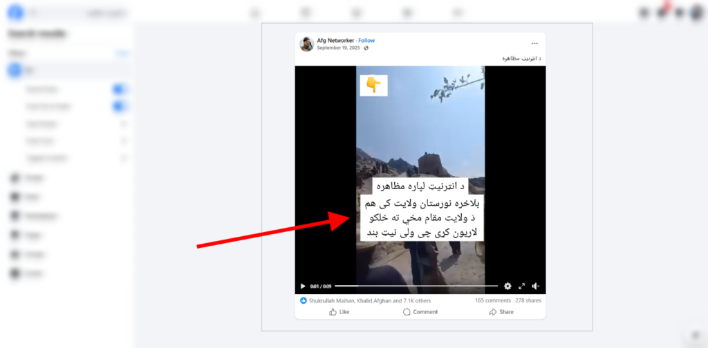 د ټولنیزو رسنیو یو شمېر فیسبوک کاروونکو یوه ویډیو له دې ادعا سره خپره کړې، چې ګواکې دغه ویډیو کې د نورستان خلک دولایت مقام مخې ته راټول شوي او د انټرنیټ بندېدو له امله یې لاریون ته مخه کړې ده. خو د دغې ادعا په اړه د فکټ کریسنډو موندنې ښیي، چې د ټولنیزو رسنیو یاد شمېر کاروونکو دغه غولوونکې ده او راټول شوي خلک د انټرنیټ بندوالي له امله د ولایت مقام مخه کې ندي راټول شوي بلکې د نورستان ولایت نورګرام ولسوالۍ یو شمېر خلک په دغه ځای کې د ځمکې پر سر شخړې له امله راټول دي.