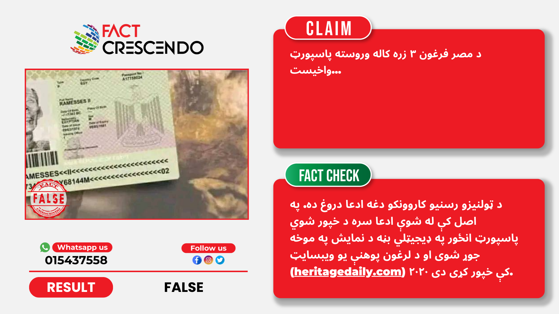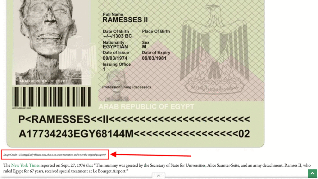 د ټولنیزو رسینو فیسبوک ګڼ شمېر کاروونکو، د یو پاسپورټ انځور، چې لرغوني فرعون ته مطلوب دی، له دې ادعا سره خپور کړی، چې ګواکې، د مصر فرعون ته ۳ زره کاله وروسته په ۱۹۷۴م کال کې د دې لپاره پاسپورټ جوړ شو، تر څو له مصر څخه فرانسې ته د دوهم رامسس (لرغوني فرعون) جسد د مومیایي کولو لپاره ولېږدول شي. خو څېړنې ښیي، چې د ټولنیزو رسنیو کاروونکو دغه ادعا دروغ ده او په اصل کې د یاد پاسپورټ انځور په ډیجیټلي بڼه د نمایش لپاره جوړ شوی او د لرغون پوهنې یو ویبسایټ (heritagedaily.com) ۲۰۲۰ کې خپور کړی دی.
