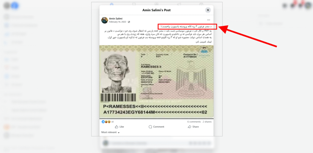لومړی تاسې کولی شئ د ټولنیزو رسنیو فیسبوک کاروونکو لاندې څو پوسټونه د نمونې په توګه وګورئ. دوی په خپلو پوسټونو کې د یاد پاسپورټ له انځور سره لیکلي دي: «د مصر فرغون ۳ زره کاله وروسته پاسپورټ واخیست. په ۱۹۷۴ م کال کې د فرعون مومیامي جسد باید د مصر څخه پاریس ته انتقال شوی وی خو د فرانسې د قانون پر اساس هر سړی باید فرانسي ته پر داخلیدو پاسپورټ له ځان سره ولري، هغه که ژوندی وي یا هم مړ…»