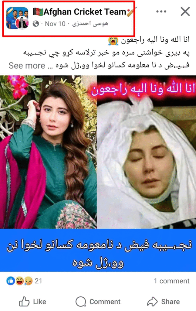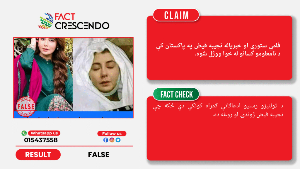 په فیسبوک پوسټ کې ادعا شوې چې ګواکي فلمي ستورې او خبریاله نجیبه فیض په پاکستان کې د نامعلومو کسانو له خوا ووژل شوه.